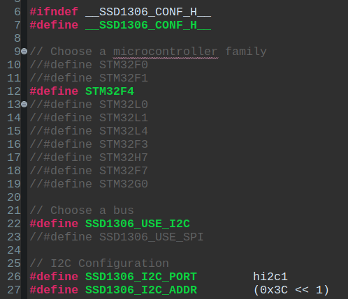 Dipilih define STM32F4 (line 12) karena pakai STM32F407. Default sudah menggunakan I2C disamping opsi lain SPI. Untuk alamat I2C default 0x3C.