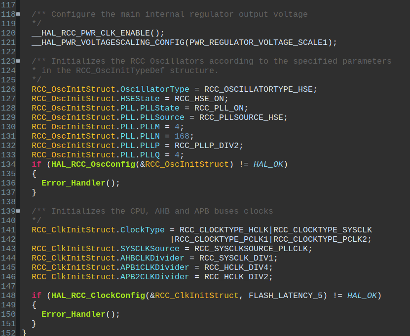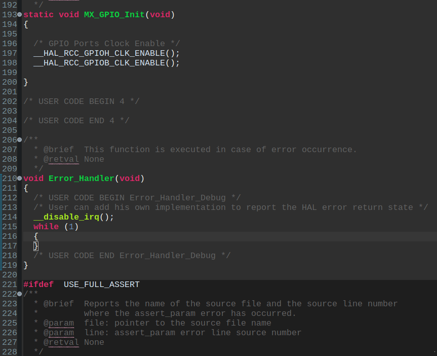 Setelah STM32CubeIDE membangkitkan kode, tambahkan line 24-26.