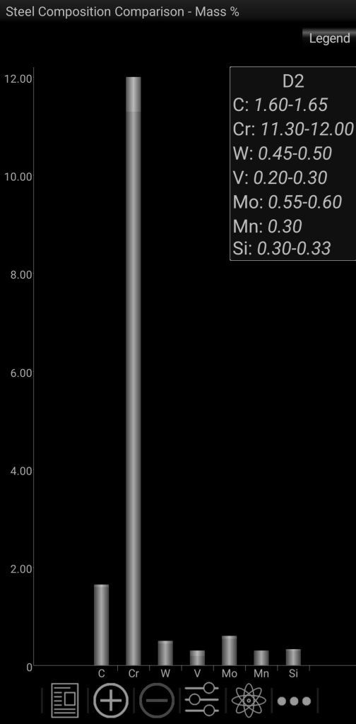 Kalau dibandingkan pisau dapur misal tipe 440A,B,C, kandungan Cr sekitaran 18% – 20%. Tapi C tidak sampai 1%. Untuk kerja kasar, pisau baja D2 jelas lebih unggul. Kompromi terbaik ada pada 440C yang punya kandungan karbon hampir 1%.
