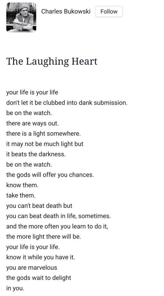 Charles Bukowski menulis beberapa novel & banyak puisi. The Laughing Heart ini satu yang favorit.