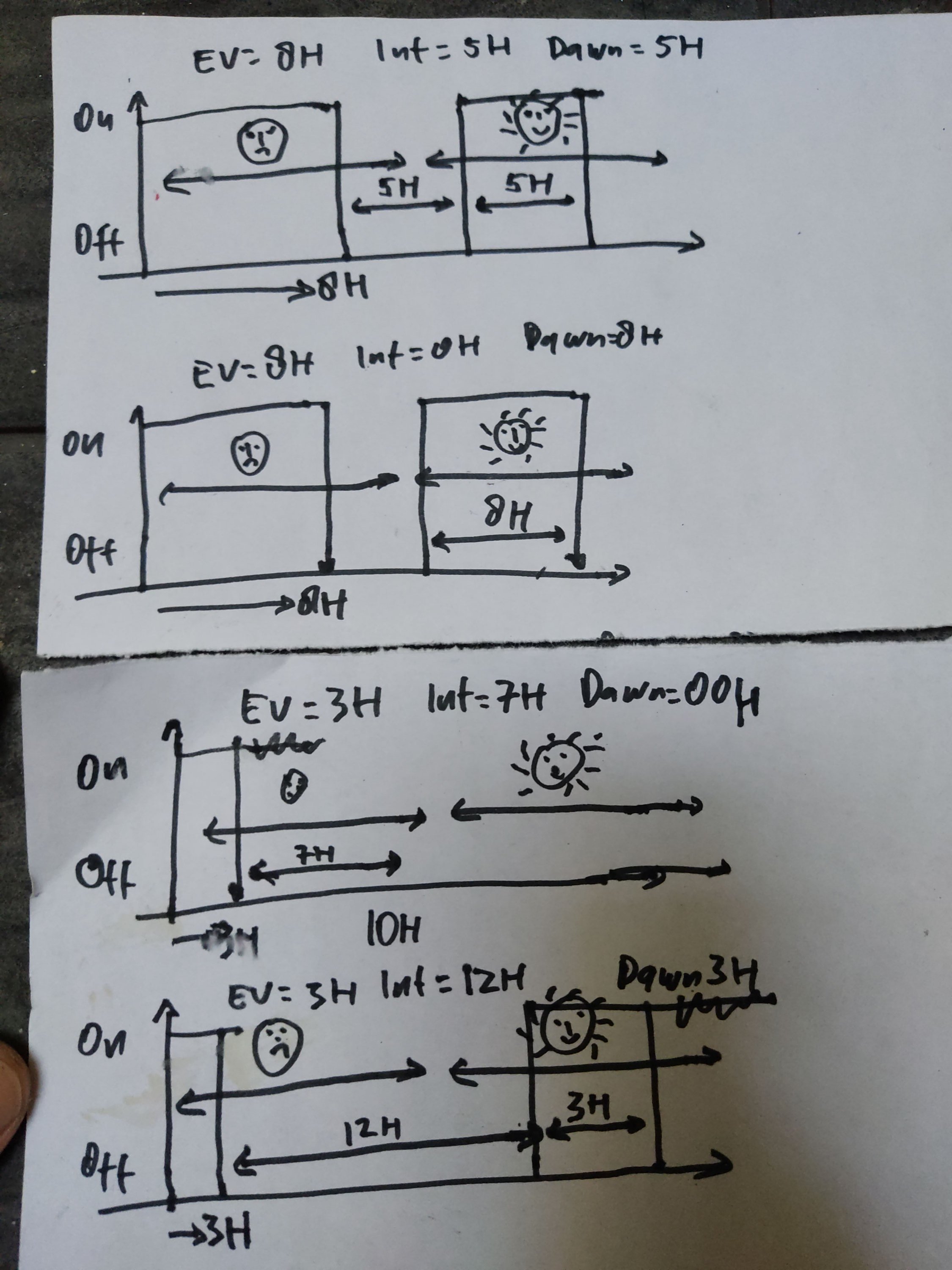 Evening. Nilai 24H (nilai Interval dan Dawn akan diabaikan). Gas polll! Nyala terus sampai Aki abis lol. Jika ingin nyala terus supply listrik ke beban, set nilai 24H. Tidak peduli pagi, malam, atau mendung, lampu warung akan nyala terus.