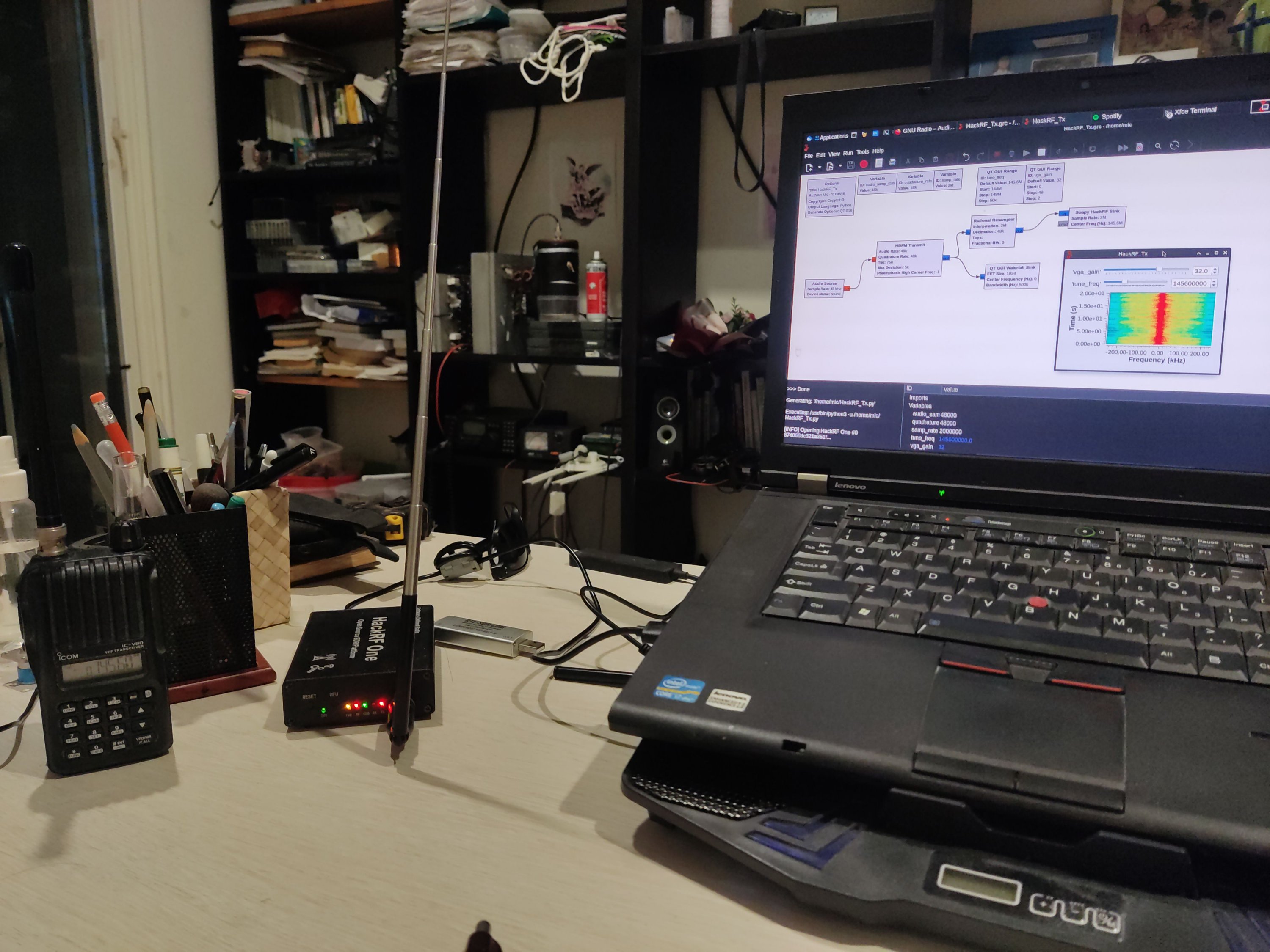 Buka Spotify, pilih lagu & minimkan volume laptop. Buka GNU Radio, mix signal audio ala NFM. Pancarkan lewat HackRF One. Dengarkan di Icom IC-V80. Tx di HackRF (file GRC di Github), Audio Source di GNU Radio.