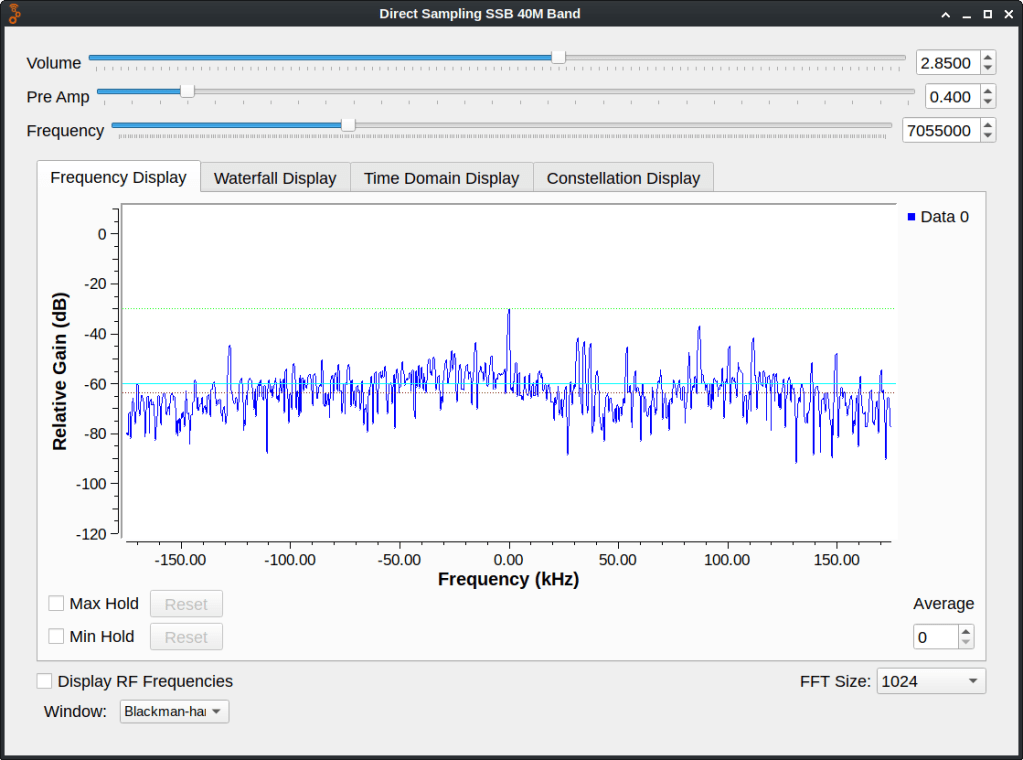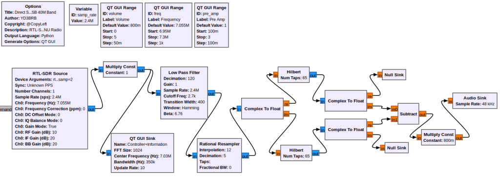 RTL-SDR V3 punya kemampuan direct sampling untuk frekuensi HF. Kali ini dicoba di GNU Radio untuk Rx SSB di 40M band. Untuk file GRC bisa di download di sini. Hal penting adalah Device arguments modul RTL-SDR diisi : “rtl=0,direct_samp=2”. Jika tidak, maka rentang HF tidak akan bisa diproses (meski jungkir balik habis kopi 5 cangkir lol).