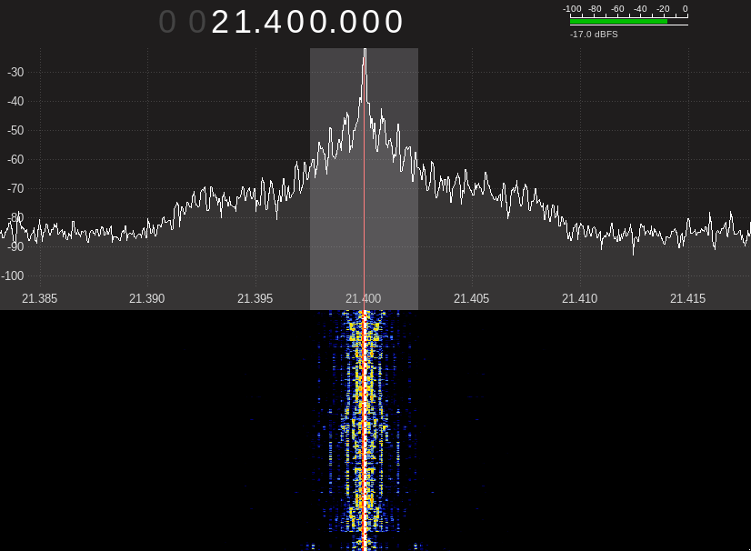 Tentu frekuensi HackRF One/ RTL-SDR perlu diset agat sesuai dengan frekuensi output blok yang ingin disadap. Sebagai contoh dari Roofing xtal filter 21,4MHz dengan bandwidth 15KHz. Maka set HackRF/RTL-SDR ke frekuensi tersebut. Dari tampilan waterfall terlihat jelas apakah spek sesuai.